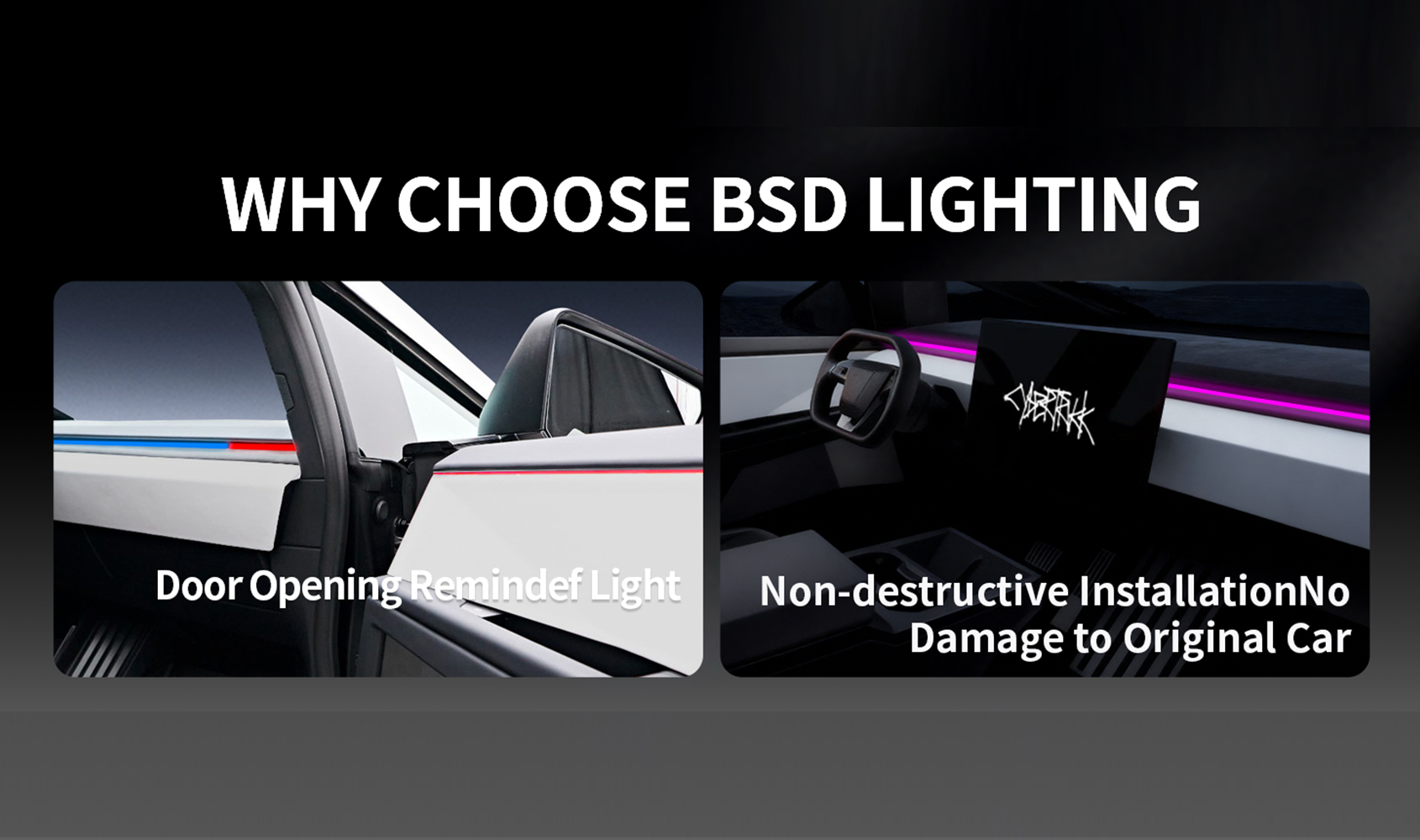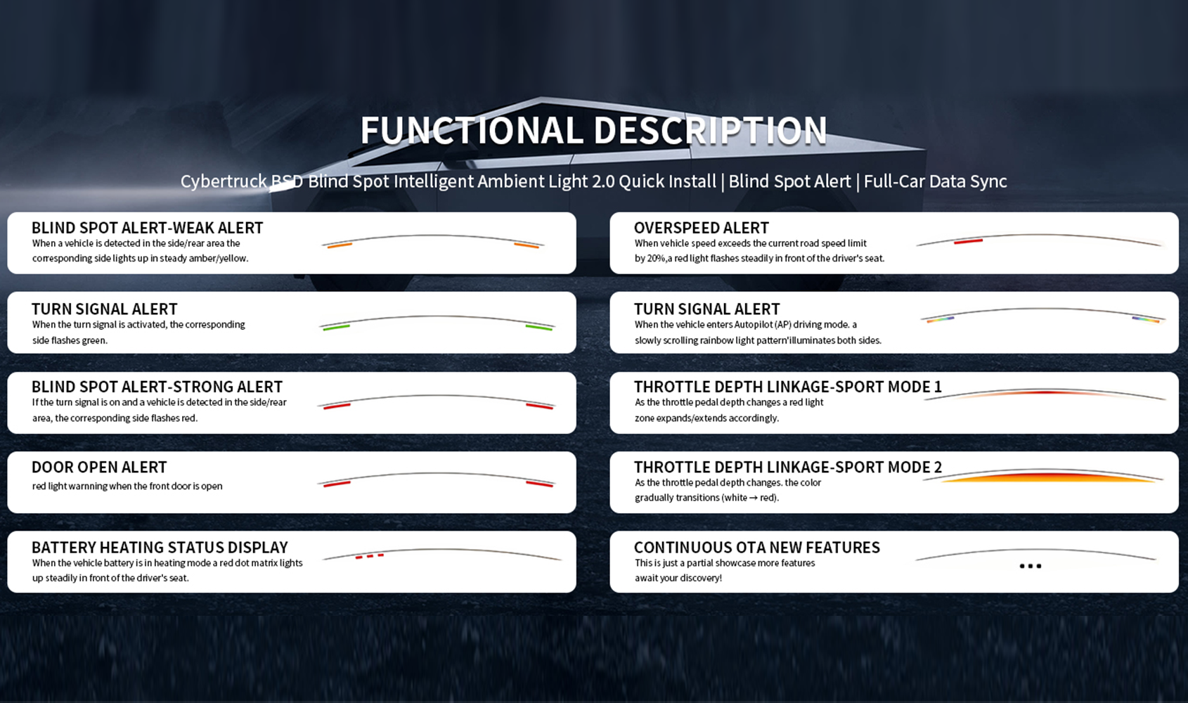 Upgrade your Tesla with our advanced Blind Spot Detection System and premium Ambient Lighting Kit, designed for?Cybertruck. Enhance safety with timely visual and audio alerts when vehicles enter your blind spots, while adding a luxurious, customizable interior glow for a modern, high-end driving experience. No-drill installation preserves your Tesla��s original look.