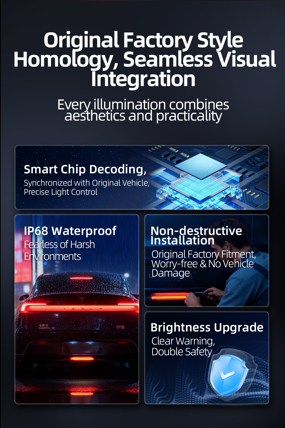Designed exclusively for the Tesla Model Y Juniper (2025.03+), this Diffused Guide Light blends seamlessly into your vehicle—just like it came straight from the factory.On daily drives, it emits a soft, diffused glow that enhances the rear presence of your car without glare.When braking, the light instantly switches to high-intensity warning mode, making your stop unmistakable even from a distance.