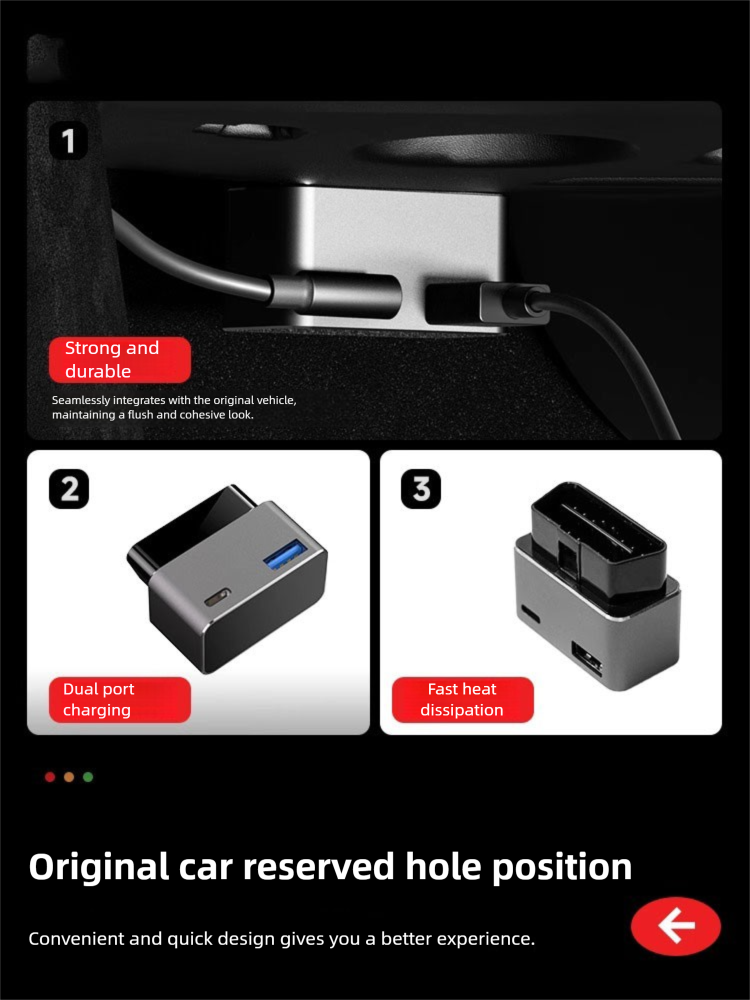 Upgrade your in-car charging with this innovative OBD fast charger featuring dual USB-A + Type-C outputs, providing efficient 36W fast charging for most smartphones. The hidden plug-in design keeps your cabin clean and uncluttered while ensuring stable connection through its 16-pin full-contact insert for long-lasting durability and safety. Built with premium aluminum alloy + ABS materials for superior heat dissipation, it delivers both performance and protection without sacrificing aesthetics or safety.