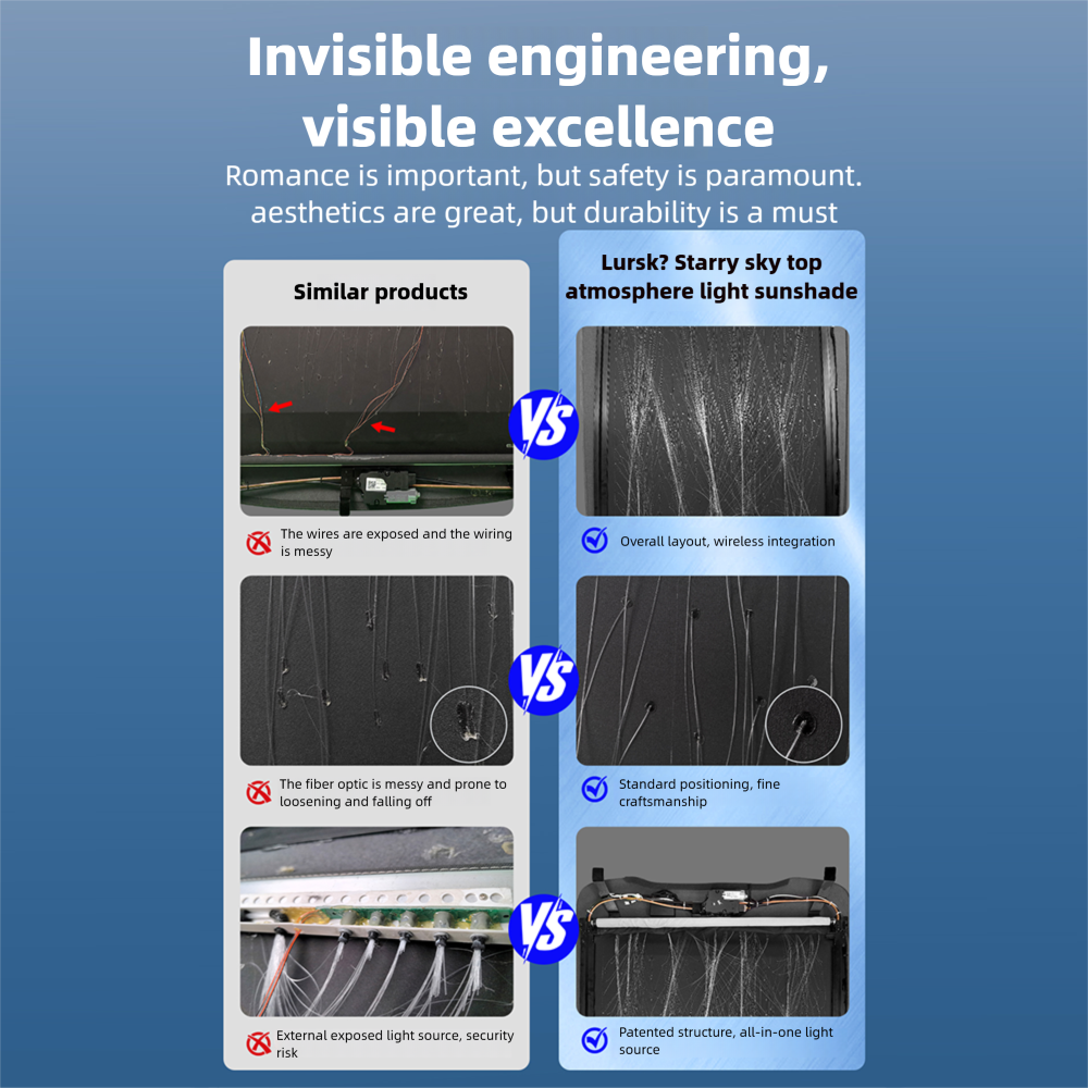 1:1 custom-fit for the original sunroof, no dismantling or wire cutting required. Clean and integrated wiring layout with patented structure and one-piece light source, minimizing risks of exposed cables or loose fibers.